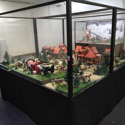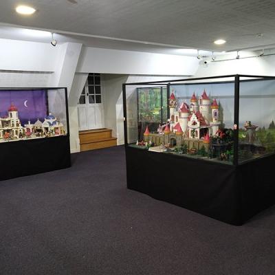 Exposition Playmobil Contes et Légendes au château de Bouthéon en 2023 - Vitrines réalisées avec la collection de Dominique Béthune
